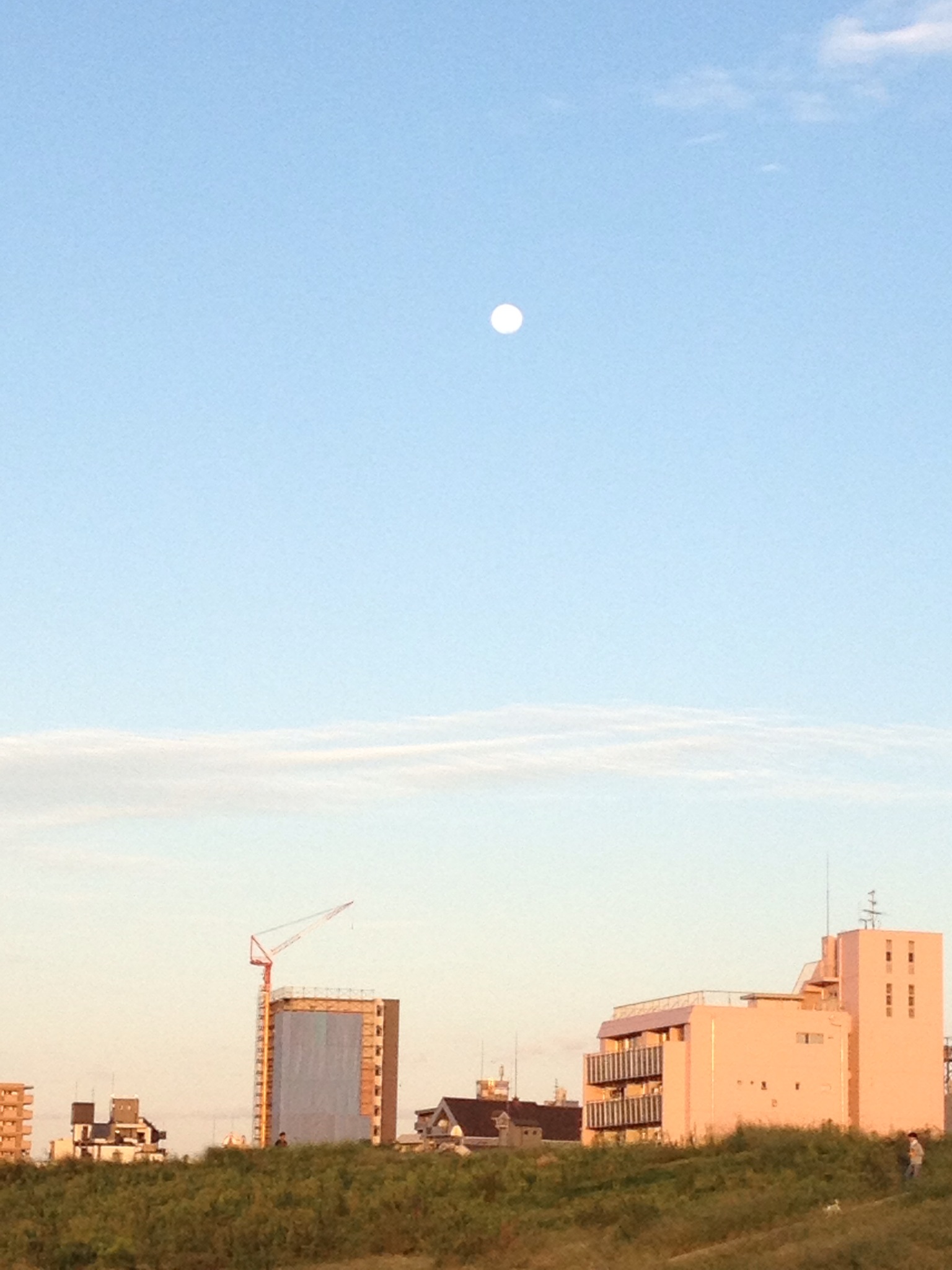 今朝。まだまん丸お月さんが空に掛かっていました。くっきり。綺麗。