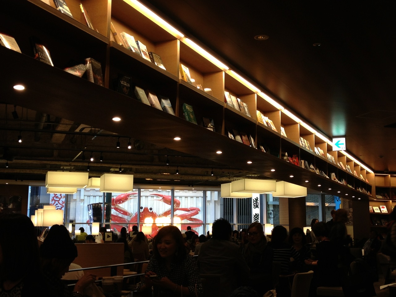 なんて感じで背伸びとアクビを繰り返しつつ窓に眼をやりますと道頓堀の蟹が赤々としております。スタバのスマートな店内とまったくそぐわないですが、これはこれで面白い。
