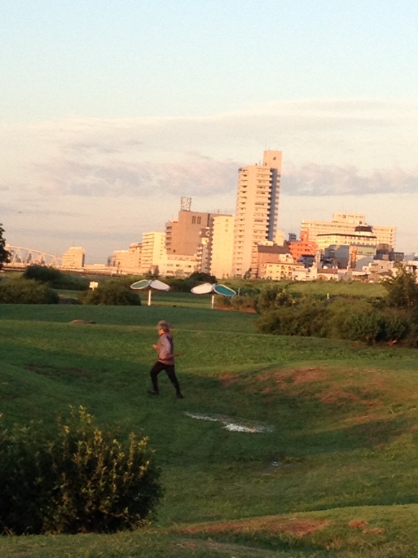 この人、晴れてる日もいつも傘を持って、そして全速力で、川原の芝生を地形に沿って大胆に、ジグザグに走り抜けてゆくのです。なんかすごい存在感です。見たらつい笑ってしまいます。一体、どこで何をしているおっちゃんなのか。たぶんいい人だと思う。